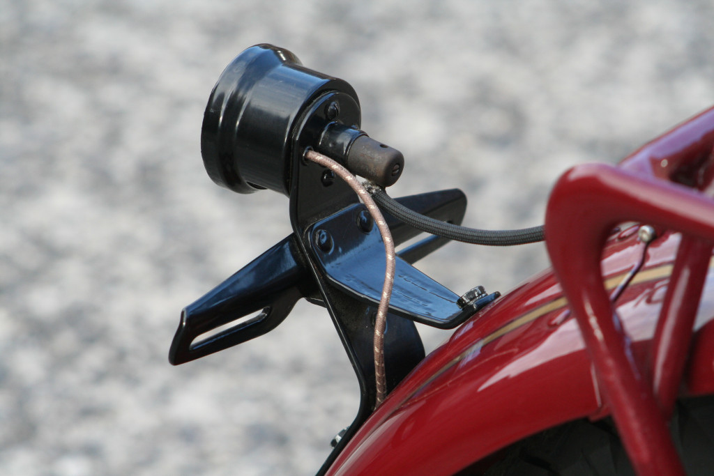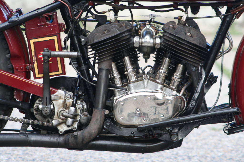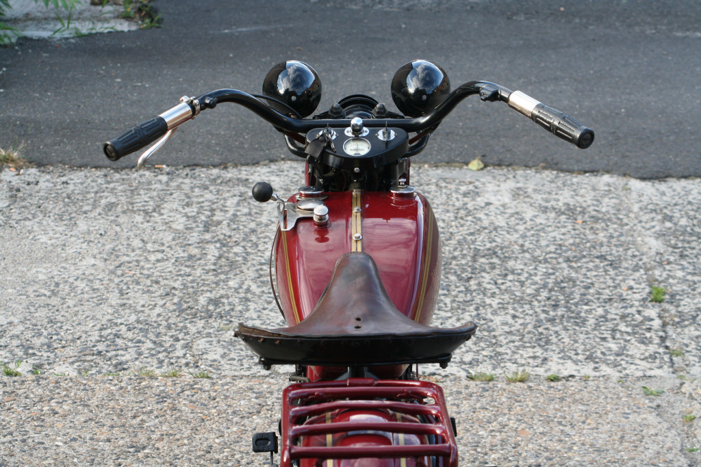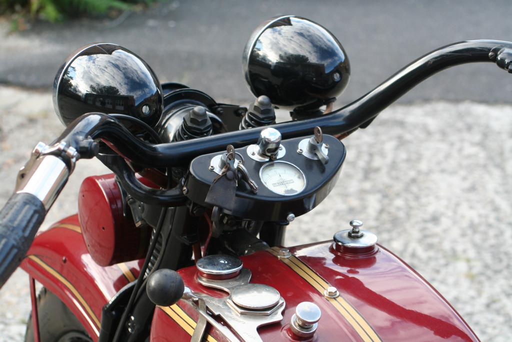 Diese Harley-Davidson DL von 1930 ist in erstaunlichem Zustand und hat die bei Harley seltene optionale weinrot Lackierung mit goldenen Zierlinien. Diese DL ist ein Produktionsmodell von Ende 1930, da nur einige tausend Exemplare produziert wurden. Der vertikale Generator ist einzigartig, da er zwei unabhängige Feldspulen hat. Bei Tageslicht wird nur eine Spule mit Strom versorgt, die zweite leuchtet auf, wenn die Lichter eingeschaltet werden. Die Doppelscheinwerfer haben separate Abblend- und Fernlichtfunktionen und werden über einen Kippschalter am rechten Lenker gesteuert. Zu den neuen Features von 1930 gehörten ein neuer Unterrahmen, gesenkgeschmiedete I-Träger-Gabeln und Tiefbettfelgen. Dieses Mittelhubraummotorrad hatte 18,5 PS und erreichte eine Höchstgeschwindigkeit von 60-65 mph, bei einer angenehmen Reisegeschwindigkeit von 50 mph.